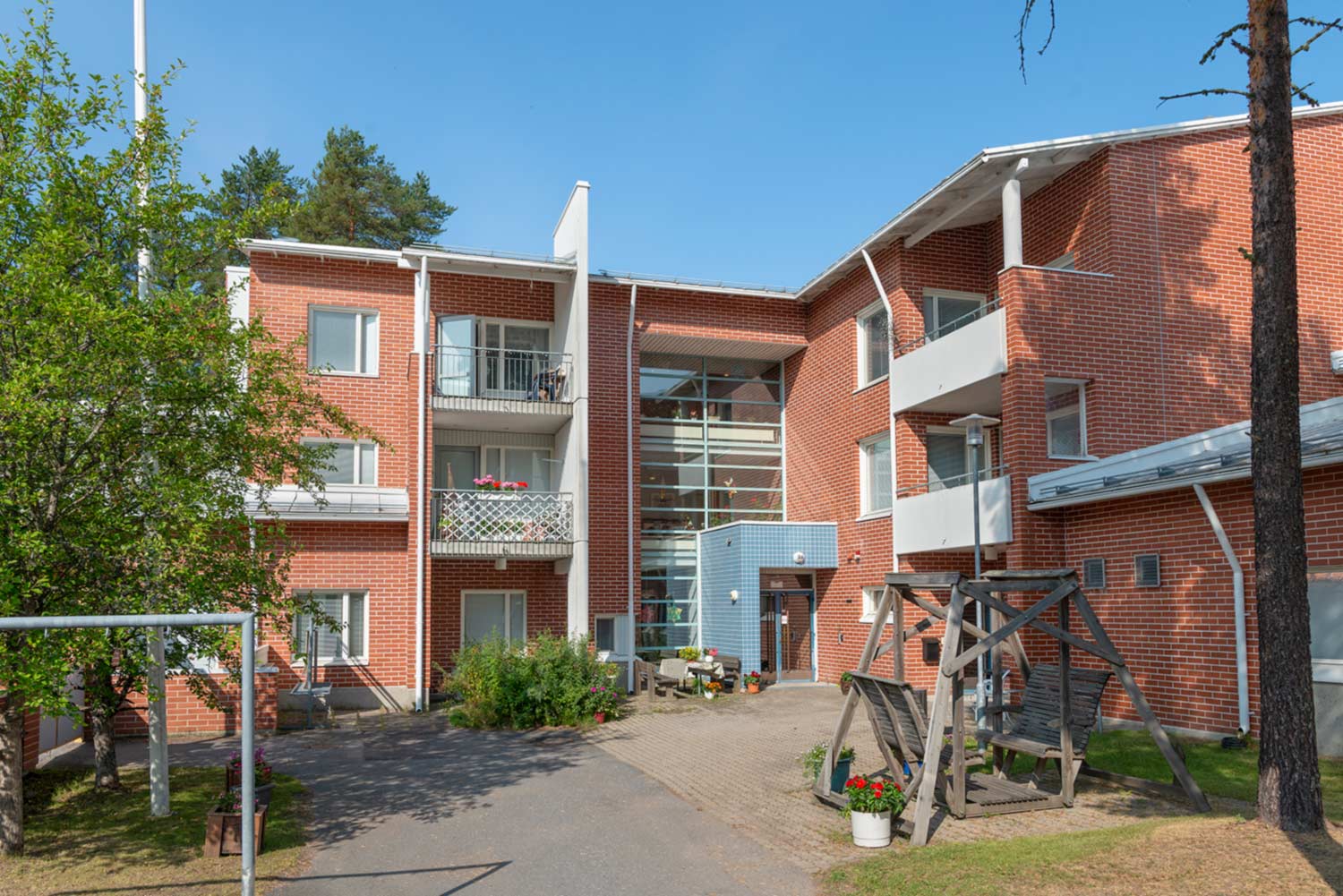 Suojaisa piha kutsuu ulkoilemaan, ja lähialueen palvelut – kuten kauppakeskus, kaupat ja apteekki – löytyvät kätevästi aivan läheltä.
